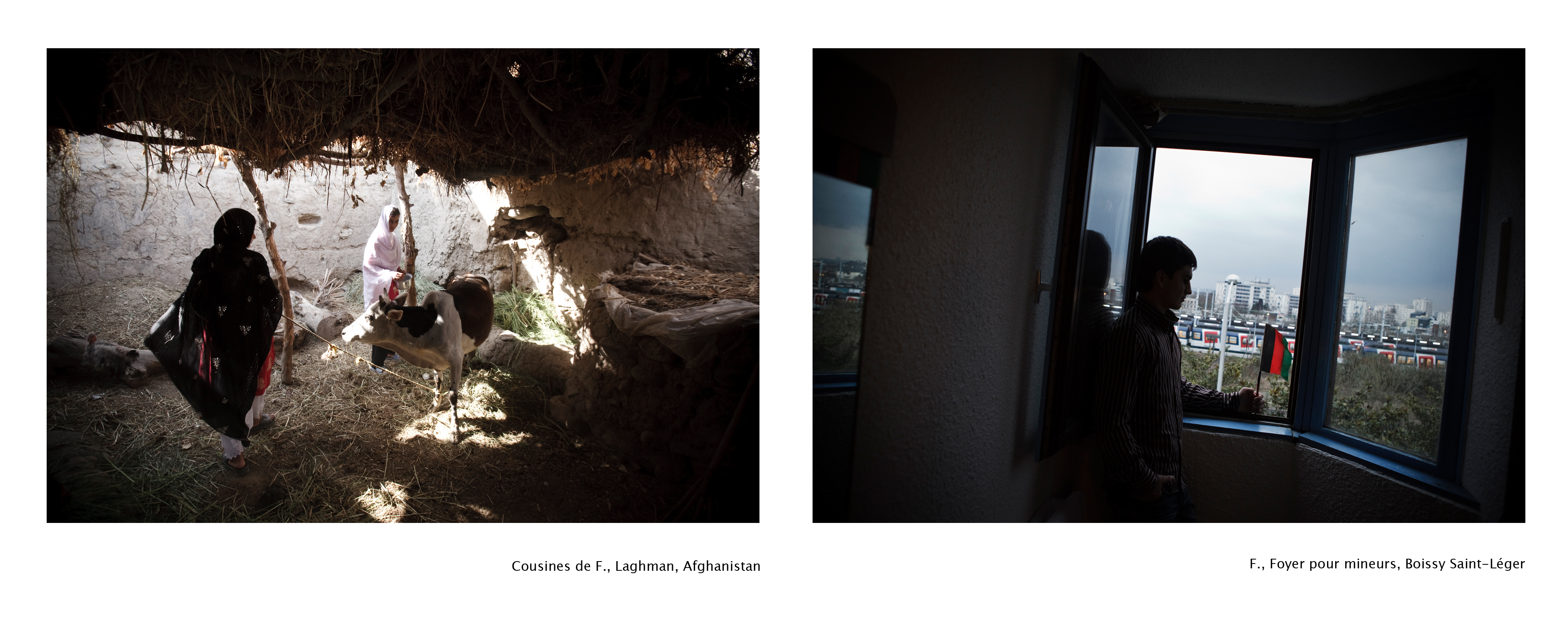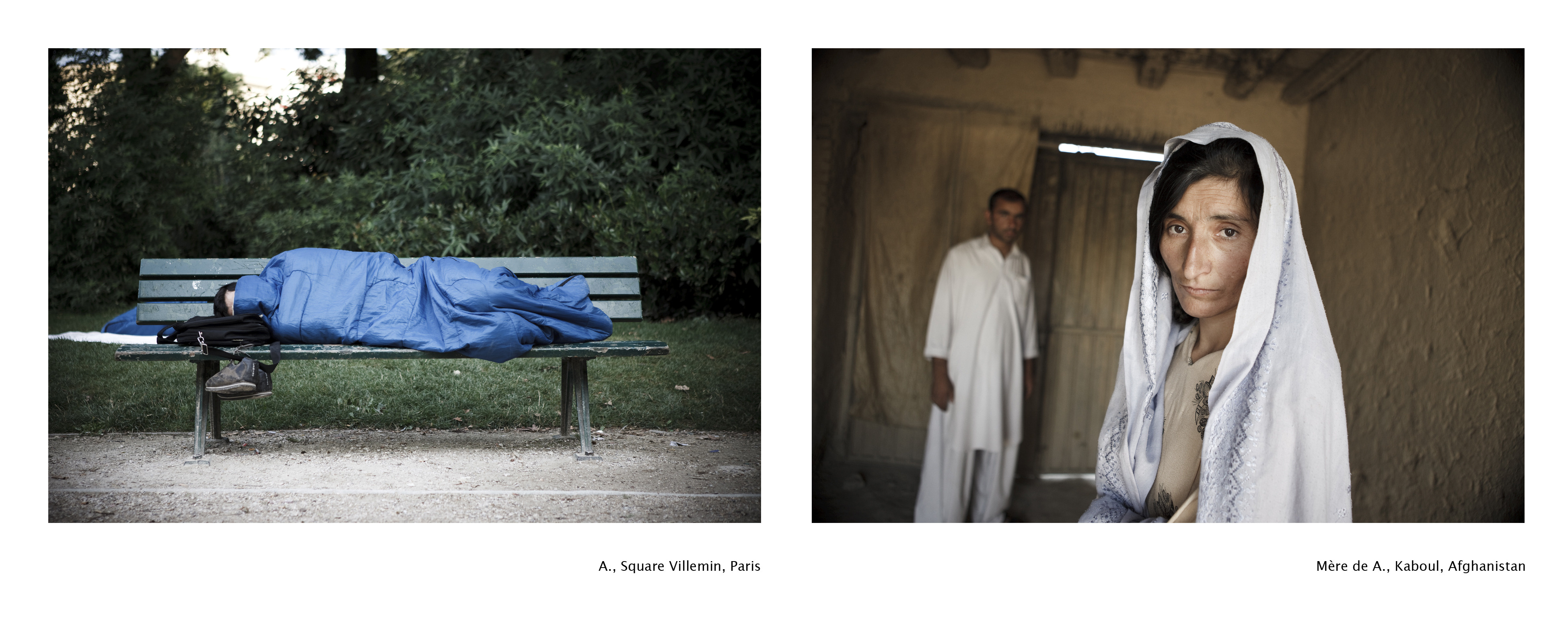 La série se présente sous la forme d’un diptyque constitué de la photographie de l’Afghan exilé en France, d’un côté, et de l’image représentant sa famille restée en Afghanistan, de l’autre côté. Dans les photographies prises en Afghanistan, des intérieurs épurés ne disposant que du strict nécessaire, une cour poussiéreuse ou encore une étendue aride. Dans celles faites en France, les jeunes hommes sont photographiés dans le square Villemin ou dans leur foyer pour ceux qui sont hébergés. L’arrière-plan de l’image laisse voir l’espace environnant : aucune appropriation de l’espace, même lorsqu’il s’agit d’une chambre. On aperçoit parfois sur certaines photographies quelques effets personnels : un sac à dos, une paire de chaussures ou encore un drapeau afghan. Qu’ils soient en extérieur ou dans une chambre, les jeunes hommes sont photographiés dans des lieux de passage ou d’attente, un endroit qui s’apparentent au non-lieu – tel qu’il est défini par Marc Augé – qui désigne par ce terme deux réalités complémentaires mais distinctes : « des espaces constitués en rapport à certaines fins (transport, transit, commerce, loisir), et le rapport que les individus entretiennent avec ces espaces » (Augé, 1992). Il s’agit de lieux au sein desquels d’ordinaire on ne demeure pas : des logements précaires et provisoires tels que les chambres d’hôtels, foyers résidentiels et camps de réfugiés. Les images de Sandra Calligaro laissent transparaître à la fois la perte du lieu où vivre, du chez soi et l’inscription dans un entre-deux spatial et temporel. Les textes accompagnant les photographies narrent la situation des deux côtés du monde sous la forme d’un récit d’une demi-page écrit à la troisième personne. Ils mettent en évidence la complexité de la mission confiée aux jeunes hommes migrants : avoir une vie meilleure ailleurs et par là faire en sorte que leurs proches puissent en bénéficier. Ils révèlent la complexité du rapport au lieu de vie hostile d’un côté comme de l’autre.