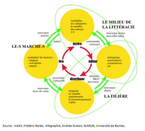 Littéracie, from the English word « literacy » (gallicized in Quebec back in 2002), designates in its widest sense the reading-and-writing actors, usages, objects and policies from all over the world. Practicing literacy as a geographer or even militating for it means accepting to distance oneself from the simple register of grande culture as a whole and from literary faith in order to take over a fabulous subject, a globalization monste, the « world library », and its endless resources (from our scale of perception). It means using various scales, alternating from single work to mass-production and edition, from the close to the distant. It also implies widening the value measures to an informal extent, to the widely-spread languages (from the international to the domestic aspect), to the margin form, far away from the huge primitive/civilized division which still lies in many people’s mind. A 2011 study on Malian literacy means to suggest that both the great normality of the Malian cultural system and the power of the Malian transcolonial system contributed to the failure of Independence scholar utopia. A critical geography, when applied to culture, and in spite of active mythologies, enables to spot the obstacles to the formation of a coherent literacy national market and to recommend that public action be taken in a more aware way in terms of territory and society, favoring at the same time a universal access to the whole reading-and-writing subject in Mali.