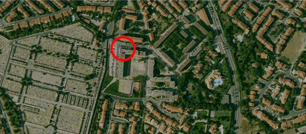 Le lieu de culte musulman géré par l’association Salam [5], dans le quartier de Saint-Martin est représentatif des mosquées inter-quartiers implantées dans ces poches urbaines de logements sociaux. Sans pour autant ressembler aux ZUP du territoire national, ces zones en tâches d’huiles dans le paysage urbain perpignanais prennent la forme d’enclaves socio-spatiales. Le bâtiment en question est situé dans l’angle formé entre deux immeubles de la Cité des Rois de Majorque. Établi sur un seul niveau en rez-de-chaussée, il est intégré à la composition paysagère du quartier. Le projet d’extension est rendu possible en surélevant le bâtiment, comblant ainsi le vide laissé dans l’angle. Le contexte urbain est celui d’une cité résidentielle qui a fait l’objet d’un plan de réhabilitation des façades et du cadre de vie exté-rieur, dans le cadre de l’ANRU (Agence nationale de rénovation urbaine).