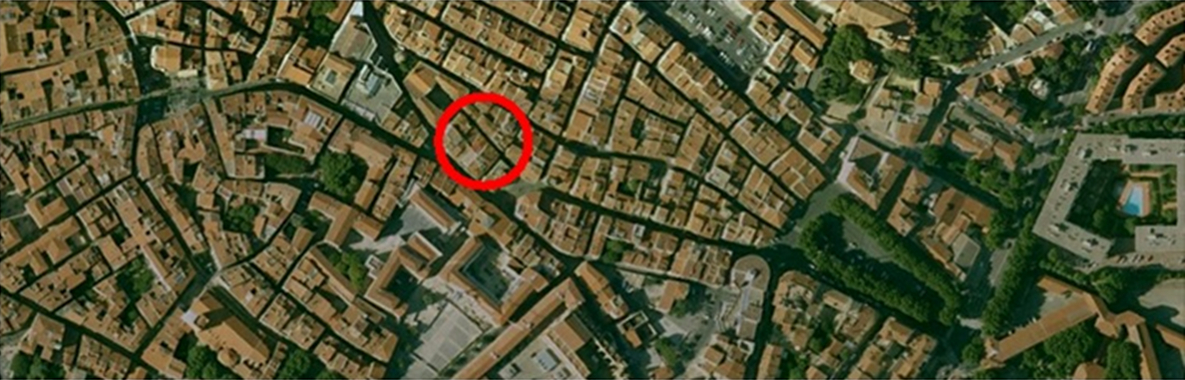 Parmi eux, la mosquée Malik [1] est caractéristique des mosquées de proximité du centre ancien de Perpignan. Situé en plein cœur de Saint-Jacques (voir la vue aérienne, fi-gure 3), l’un des quatre quartiers du centre ancien de la ville, l’immeuble de trois étages est inséré dans un ensemble de bâtiments étroits. Placé en secteur sauvegardé, le quartier est caractérisé par l’insalubrité et fait l’objet d’une OPAH (Opération programmée d’amélioration de l’habitat). Le quartier classé en zone urbaine sensible est actuellement en pleine requalification.
