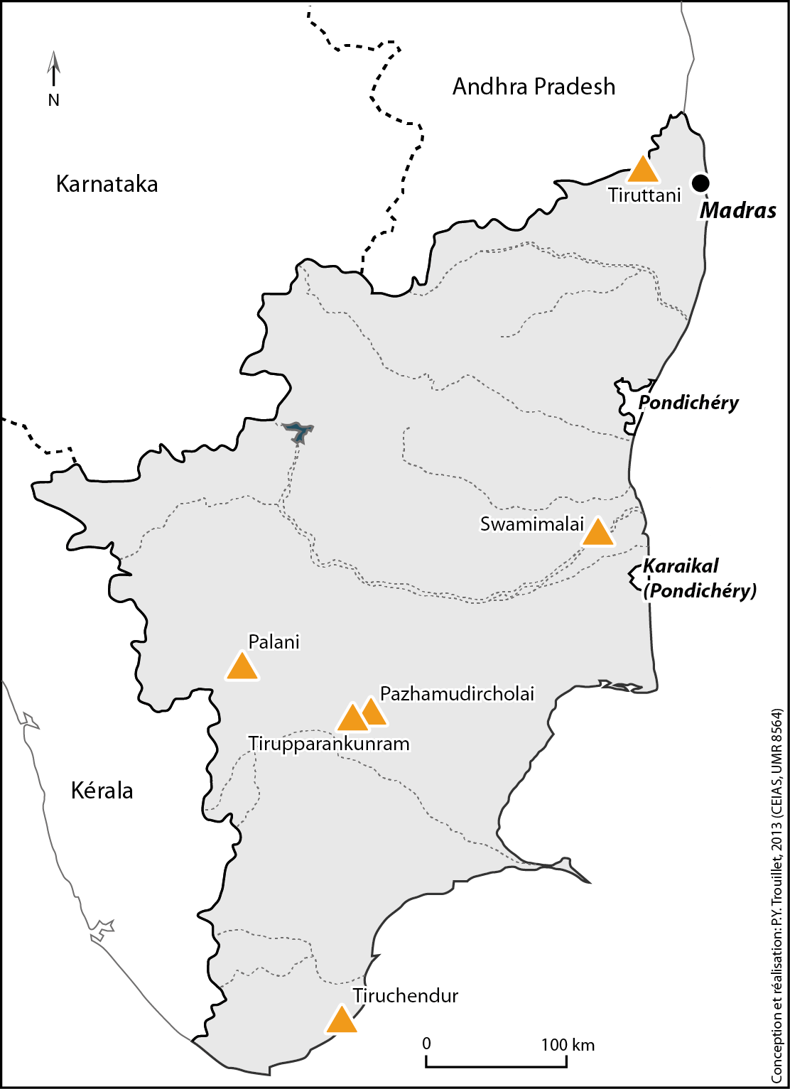 Il est utile de s’interroger aussi sur la traduction de ces luttes sociales, politiques et identitaires en termes de géographie religieuse, car elles ont été d’une importance majeure dans la constitution du territoire et de la scène politico-identitaire du pays tamoul contemporain. Changeons donc à nouveau d’échelle et observons comment le pèlerinage et l’image de certains dieux ont pu alimenter et traduire des luttes sociales, ainsi qu’une idéologie territoriale ayant profondément marqué cette région.