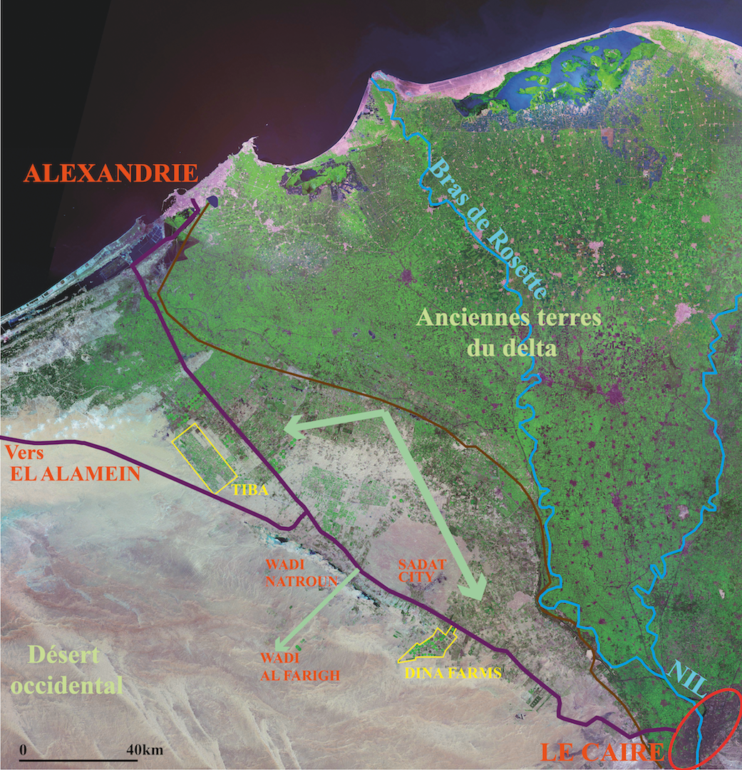 Les nouvelles terres de l'ouest du Delta s'étendent sur une longueur de 200 kilomètres environ et une profondeur de quelques kilomètres à quelques dizaines de kilomètres le long de l'autoroute qui relie Le Caire à Alexandrie (Fig. 4). Ce front de conquête agricole est structuré par trois noyaux urbains principaux – Sadate City, Wadi Natroun, Ville de Nubariya – et par un ensemble de villages, de création récente (années 1990) à l'ouest de l'axe routier vers Alexandrie et plus ancienne dans la partie orientale (années 1950-60), le reste de l'habitat étant très dispersé. Elle ne correspond pas à une entité administrative propre, mais appartient à plusieurs gouvernorats qui ont la singularité de s'étendre à la fois sur le Delta et le désert : Giza, Beheira et Alexandrie. Les exploitations agricoles qui s'y sont développées résultent conjointement de projets étatiques et de dynamiques d'appropriation individuelle et sociétaire.