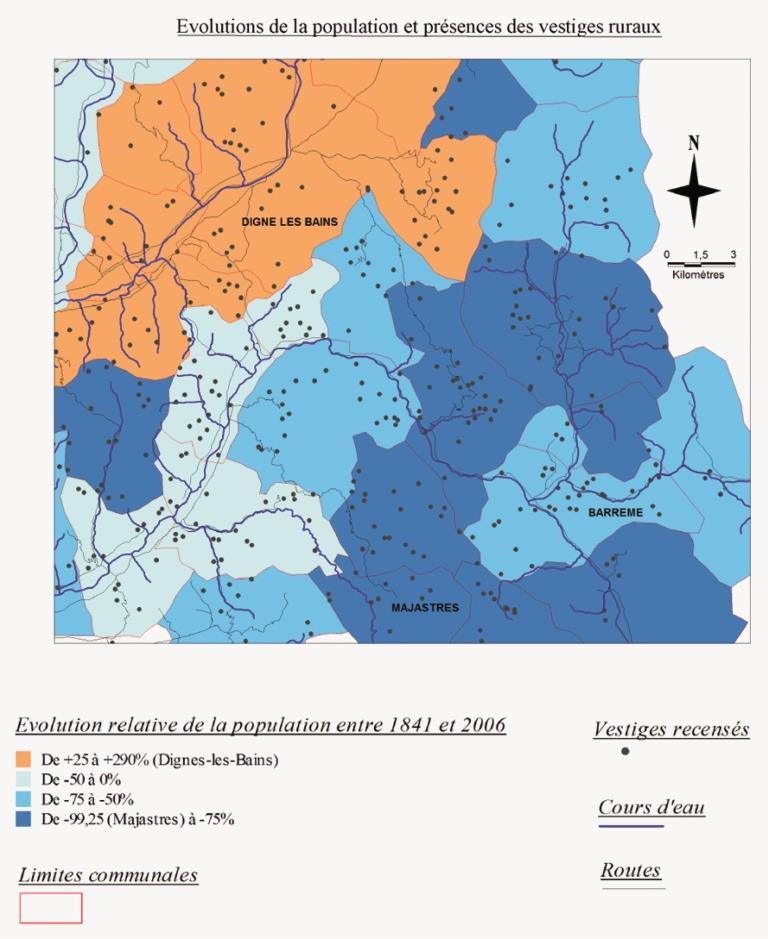 On constate que seule la commune de Digne-les-Bains n’a pas perdu de population entre 1841 et 2006. Dans les autres zones, malgré la stabilité voire la hausse de la population actuellement en cours, la population est toujours inférieure à ce qu’elle était au 19ème siècle. Ceci est particulièrement vrai dans le « bloc de Majastres » (autour de la commune éponyme, dans l’angle Sud-Est ici), massif très isolé et compact (le village de Majastres lui-même n’est relié à la vallée de l’Asse que par une route, en très mauvais état, se terminant en cul de sac après 15 kilomètres et le passage de gorges spectaculaires).