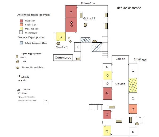 Plusieurs signes indiquent que l’habitat en cortiço, tout temporaire qu’il soit pensé, tout collectif qu’il soit, donne lieu à des dynamiques d’appropriation. Nous formulons même l’hypothèse que l’étude de la micro appropriation au sein du cortiço peut participer à mieux comprendre le rapport à la ville de ses habitants (Staszak, Collignon, 2003). C’est en étudiant l’espace de l’intime et du lieu de vie quotidien que représente le logement que l’appréciation du rapport au reste de la ville peut être développée. Les rapports à l’espace intra-cortiço peuvent être corrélés aux rapports à l’espace du quartier, de la région urbaine (centre, périphérie, deuxième couronne…), voire de l’ensemble des espaces de la ville d’étude. Comment les appropriations de l’espace interne du cortiço peuvent-elles expliquer l’appropriation plus large à l’échelle de la ville ?