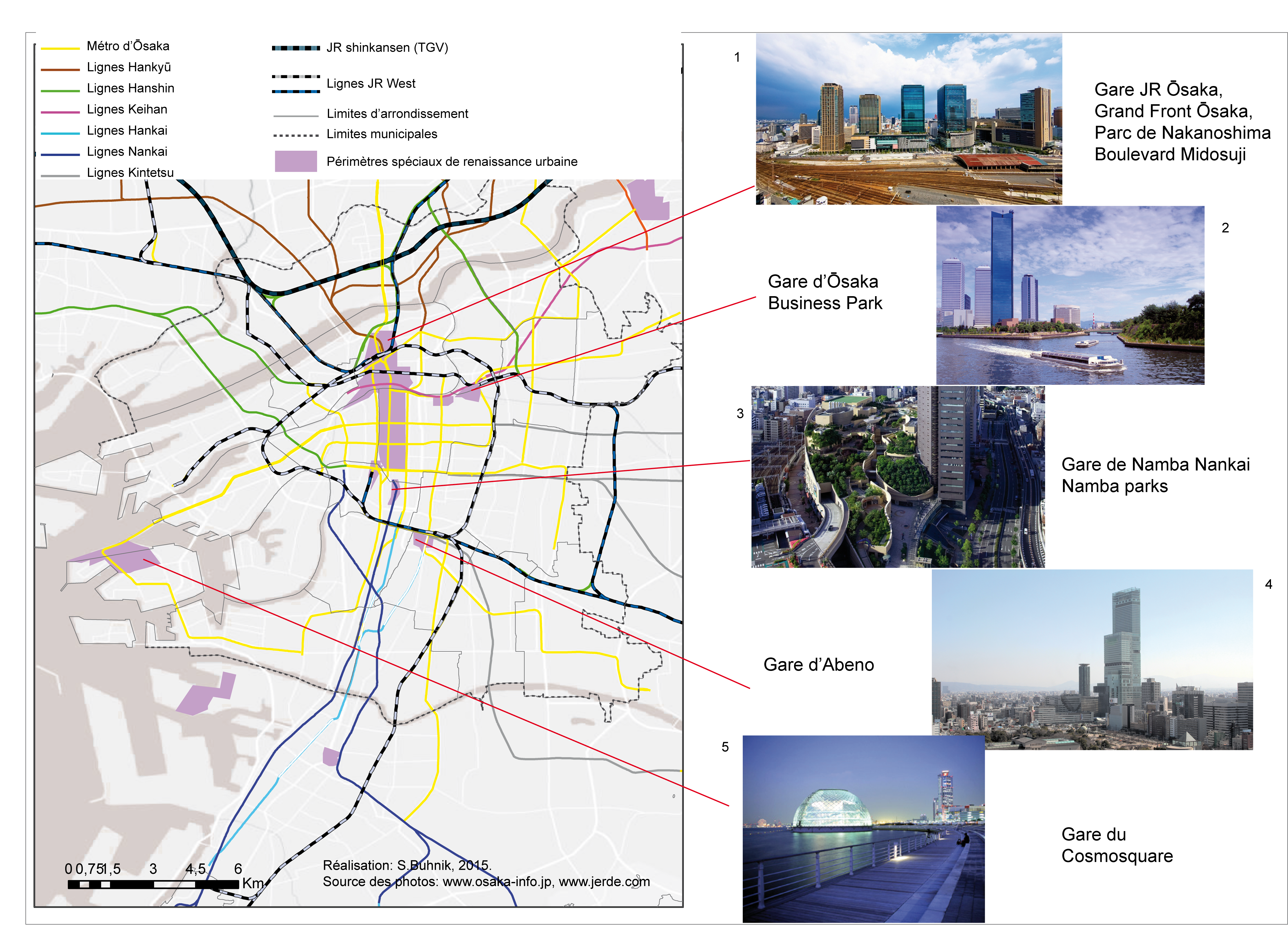 Figure 2. Réseau ferroviaire et périmètres de renaissance urbaine à Ōsaka