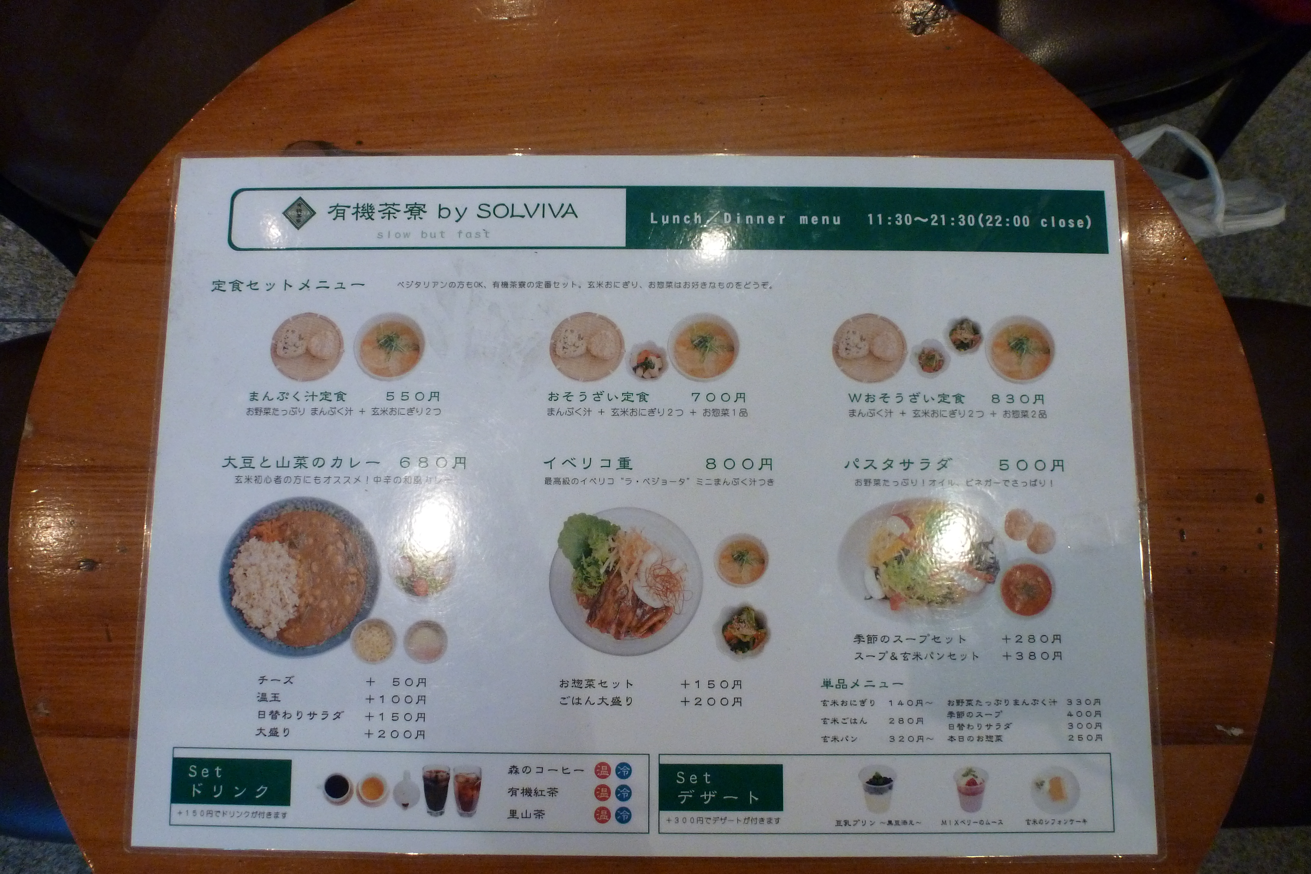 D’abord, les objectifs du directeur de la chaîne Solviva peuvent être décrits comme une alliance d’opportunisme et de croyance sincère dans les vertus de la lenteur en ville. Takeuchi Kōtoku explique sur son site qu’il a déposé sa marque en 2000 après avoir quitté la firme agroalimentaire qui l’employait. La rencontre avec un producteur de jambon en Estrémadure crée un déclic ; avec l’appui d’un prêt bonifié accordé par Food Action Nippon, il ouvre à Umeda un restaurant qui accommode des légumes séchés du Kansai à du jambon ibérique. C’est le souhait de se tourner vers une clientèle modeste qui l’incite à ouvrir un slow café alliant les bienfaits de l’agriculture biologique à l’efficacité du fast-food et ses prix « raisonnables ». Les menus du café vont de 700-800 à 1300 yen, soit 5,50 à 10 euros, pour du curry ou du jambon, du riz, une salade et une soupe.