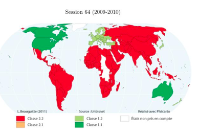 Commentaire de la figure 1 : Ces deux cartes montrent les partitions obtenues en utilisant une méthode d’analyse des réseaux sociaux (équivalence structurale) sur les similarités de vote entre Etats lors de deux sessions. Les Etats absents lors de plus de 30% des votes d’une session ne sont pas pris en compte. Si la disparition du bloc socialiste entraîne un élargissement de l’ensemble européen, et si on peut noter l’évolution de la Turquie dont les comportements de vote à l’Assemblée générale s’alignent de plus en plus sur les stratégies de l’Union européenne, la stabilité des découpages politiques l’emporte.