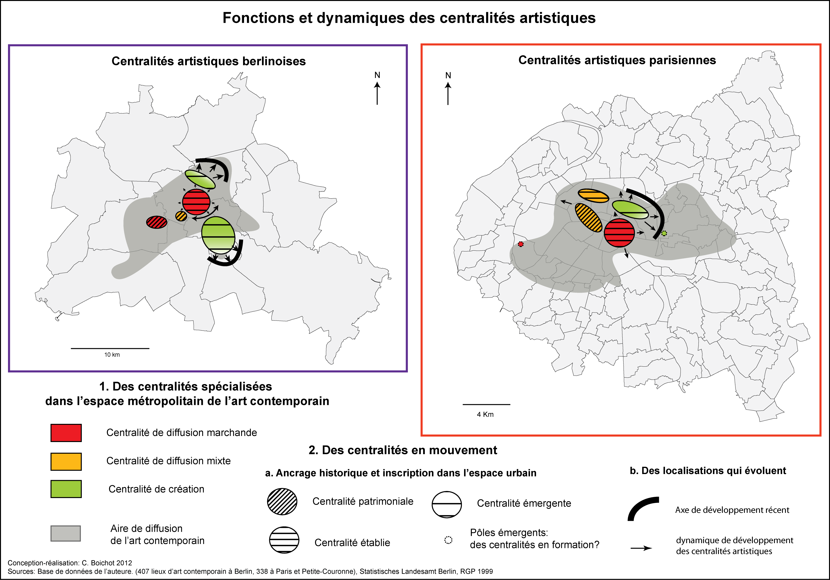 Pour tenter de valider ces hypothèses, une recherche comparative a été menée à l'échelle des métropoles parisienne et berlinoise, qui combine une analyse quantitative des lieux et des expositions de l'art contemporain et une analyse qualitative des pratiques et des discours d'artistes plasticiens installés à Montreuil et à Neukölln. Une base de données originale regroupant 407 lieux d'exposition et 1108 artistes exposés (janvier 2010) pour le cas berlinois et 338 lieux et 769 artistes exposés (janvier 2010) pour le cas parisien a permis, sur la base d'analyses statistiques multivariées, de caractériser l'organisation des lieux de l'art contemporain à Paris et à Berlin en termes de spécialisation fonctionnelle, de localisation ou encore de durée d'installation, ainsi que les dynamiques d'échanges artistiques qui qualifient la position de ces deux villes dans un système artistique international. L'analyse des pratiques spatiales des artistes à l'échelle intra-urbaine a d'autre part été menée sur la base d'entretiens, d'observation ethnographique et de participation observante dans deux espaces à forte présence artistique : Montreuil à Paris et Neukölln à Berlin. L'enquête qualitative répond au double objectif de comprendre les logiques territorialisantes de la création artistique et de saisir les articulations entre ancrages et circulations qui structurent les espaces de vie des artistes.