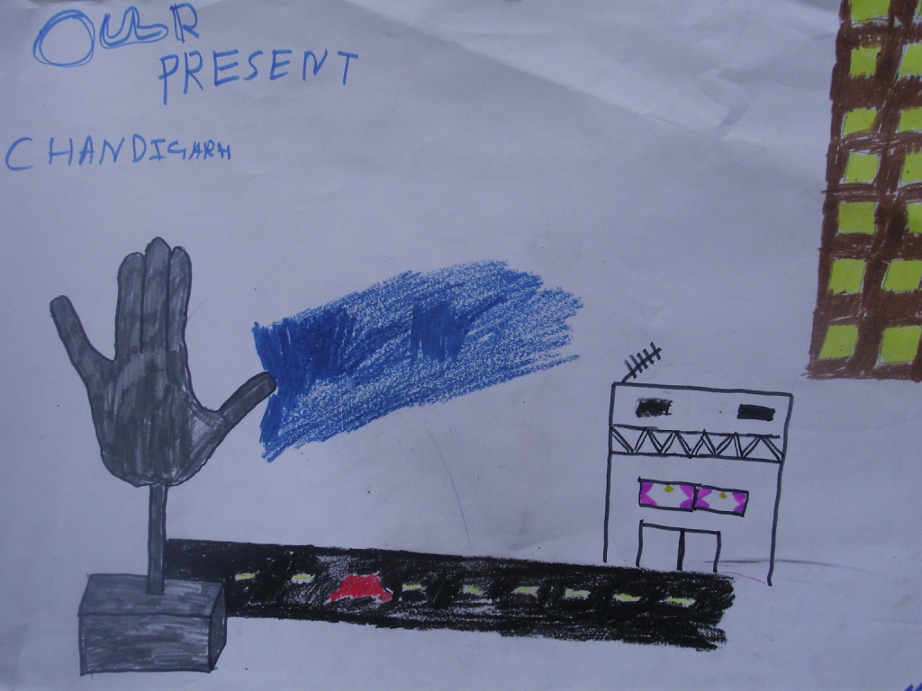 Si nous analysons l'ensemble des dessins, nous pouvons constater que la ville contemporaine est globalement perçue comme un espace rigide, ennuyeux, extrêmement organisé et entouré de frontières figées. A l'inverse, les enfants imaginent pour l'avenir une ville de désordre et de surprises, joueuse et centrée autour de la figure de la Main Ouverte. Si les représentations urbaines semblent particulières au sein des villes nouvelles (Cavallini, 1997), il nous faut néanmoins remarquer que le poids symbolique de Chandigarh dans l’imaginaire et les discours aux échelles locales et nationales semble avoir un impact considérable sur les perceptions citadines, telle qu’en témoigne la forte représentation de la Main Ouverte dans les dessins d’enfants en écho à l’iconographie officielle.