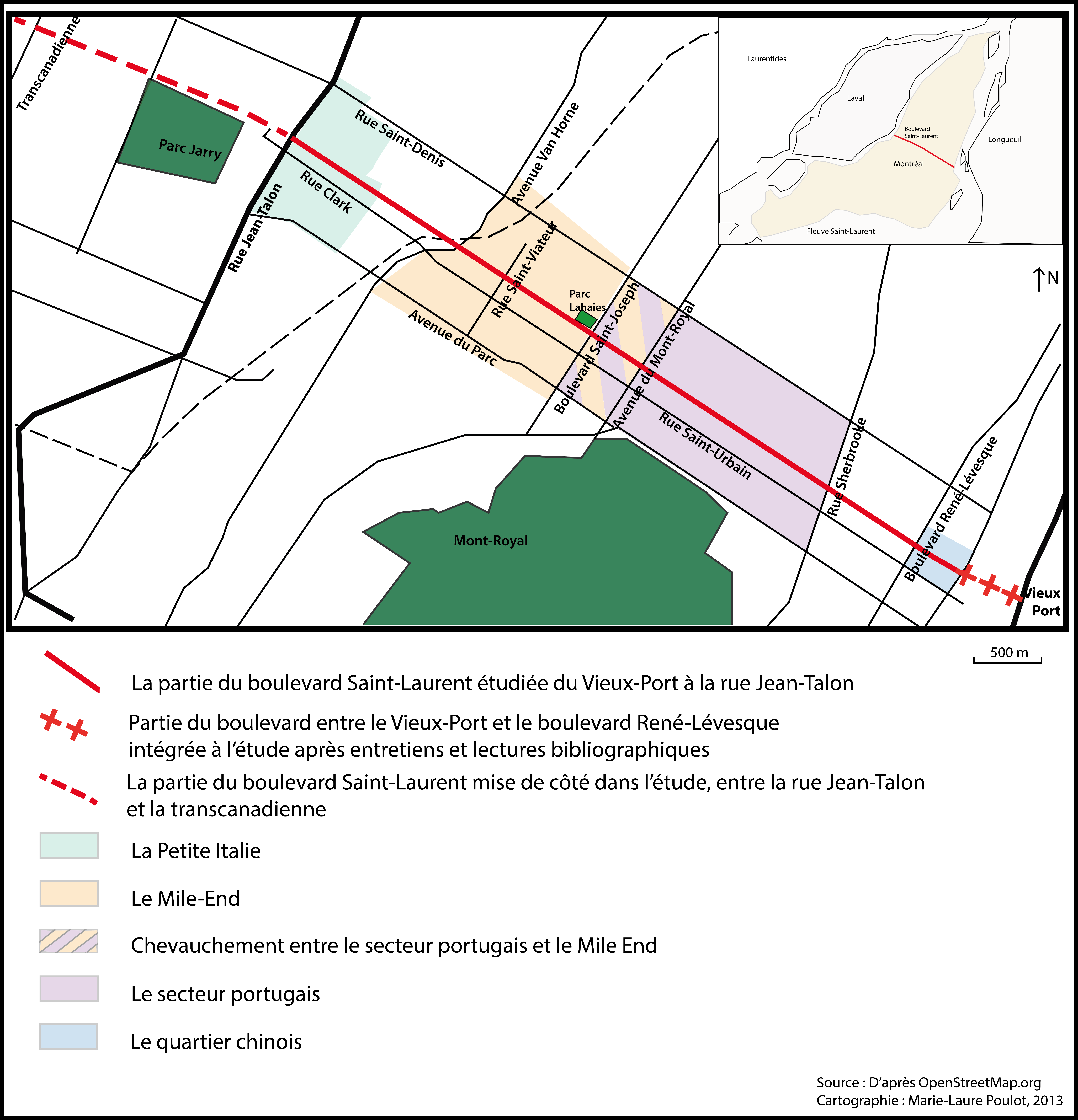 Figure 2 : Le boulevard Saint-Laurent au sein de la ville de Montréal : les limites Nord-Sud et Est-Ouest mises en lumière par la marche
