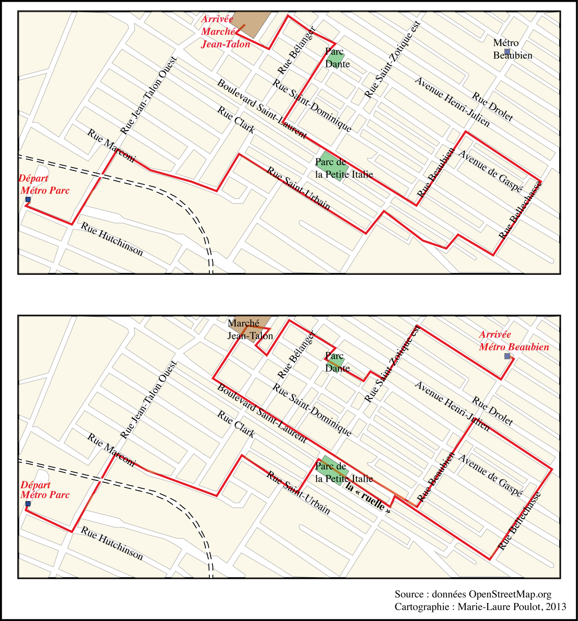 Figure 3 : La première carte présente l’itinéraire proposé par Michel avant la promenade, tandis que la seconde carte montre l’itinéraire effectivement suivi