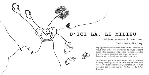 3-Lauriane Houbey a travaillé avec les voyageurs à la constitution de cartographies sonores, qui donnent à entendre les souvenirs des bruits entendus pendant les voyages, et souvent associés à des milieux spécifiques (montagnes, déserts, mers...). Son travail s'est appuyé notamment sur le commentaire des cartes dessinées avec Sarah Mekdjian, Anne-Laure Amilhat-Szary et Marie Moreau. L’œuvre sonore réalisée, intitulée « D'ici là le milieu », est présentée par l'artiste dans la figure 5.