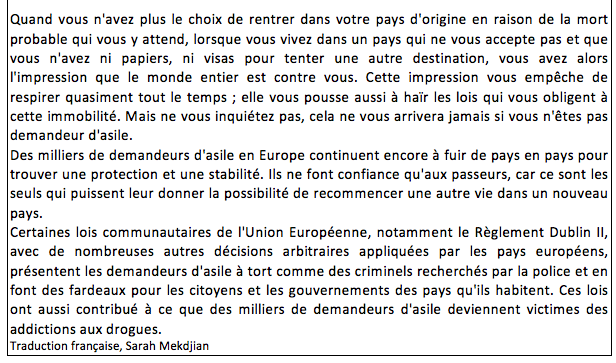 Comme les ateliers de cartographie, ce texte est polyphonique et expérimental. A défaut de théorisation définitive, nous proposons d'ouvrir en acte un espace d'échanges à plusieurs voix sur cette expérience en cours. Plutôt que de parler au nom des migrants, des artistes ou des chercheurs engagés dans ce projet, plusieurs participant.e.s ont saisi l'opportunité de s'exprimer en leur propre nom. Les échanges entre les participant.e.s ne sont pas rapportés sous forme de citations. Pendant les ateliers, les voyageurs n'ont pas été interviewés par les chercheurs ni écoutés à partir d'une méthodologie de recueil de récit de vie. Chaque participant s'est exprimé dans le cadre d'un travail cartographique proposé par les chercheurs et les artistes et discuté en commun.