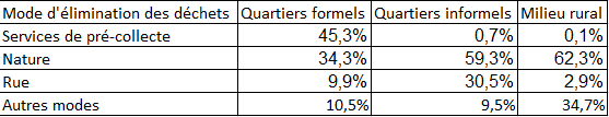 Les données de l’OPO montrent que 45,30% des ménages des quartiers lotis font recours aux pré-collecteurs pour l’élimination des ordures ménagères (figure 5). Ce service est presqu’absent dans les quartiers informels où seulement 0,7% des ménages éliminent les déchets à travers les pré-collecteurs.
