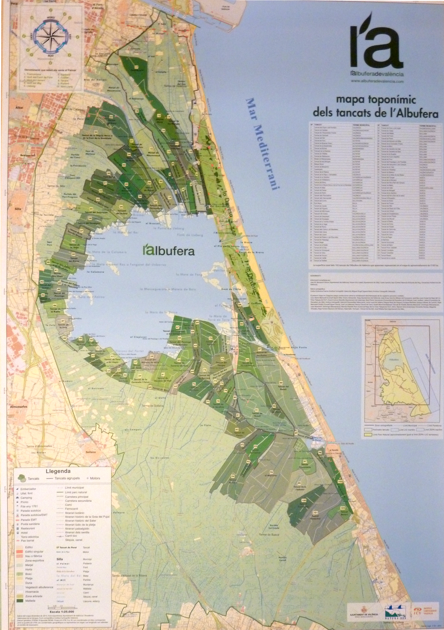 Les tancats se dégagent en verts plus foncés. Les rizières irriguées par l’eau des fleuves apparaissent en vert pâle. La Devesa est représentée en vert vif et la huerta (les orangeraies et maraîchages) en jaune pâle.