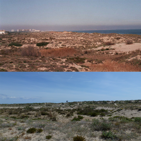 La photo du haut est prise depuis les dunes du Canyar, montrées par José Luis en 2004, suite à leur restauration en 1991. On aperçoit au milieu à droite les quadrillages de roseaux des dunes de la Malladeta, qui avaient été restaurées de 2001 à 2003. La photo du bas représente ces mêmes dunes de la Malladeta dix ans plus tard.