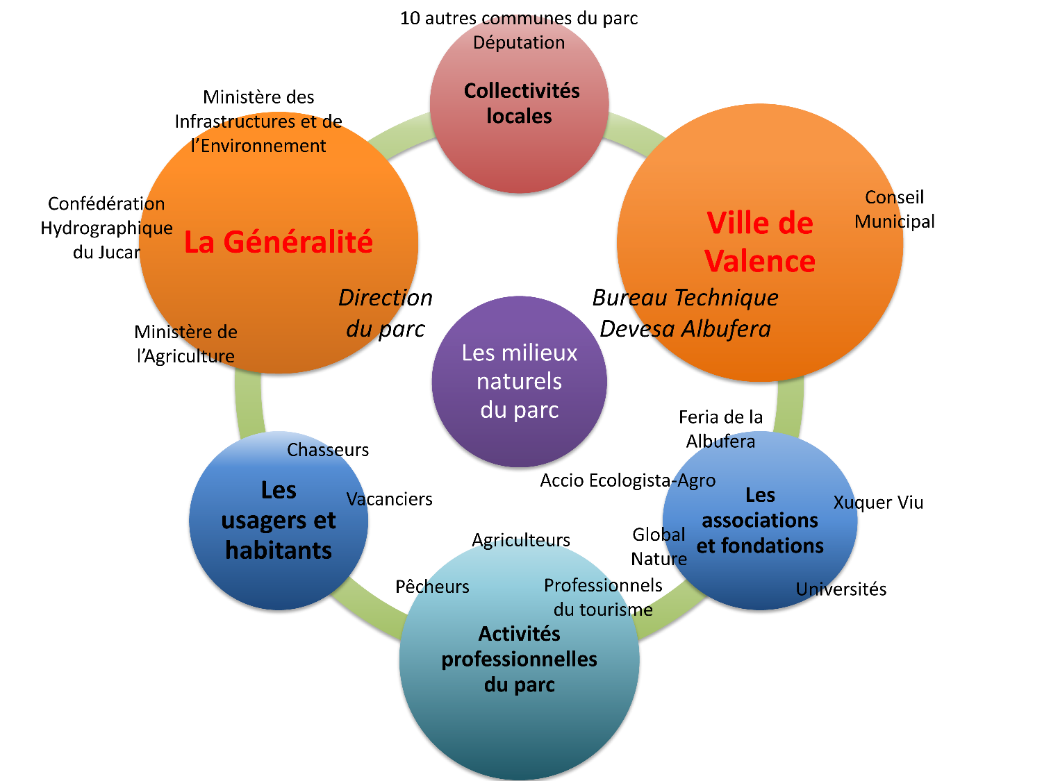 Figure 4. Les principaux acteurs de l’Albufera, plus ou moins proches des milieux naturels, dominés par la Généralité et la Ville de Valencia (situation de 2014)