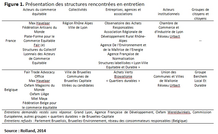 Un décentrement du commerce équitable vers d’autres espaces et dynamiques d’acteurs est perceptible autour de nouveaux enjeux liés à son inscription dans les politiques publiques (Smith, 2011). Cette évolution ouvre des perspectives originales de recherche et élargit le champ des disciplines concernées, avec notamment la géographie. Mon sujet de thèse, « Les "Fair Trade Towns", une mise en territoires du commerce équitable au nom du développement durable ? Regard multi-sites France, Belgique », s’inscrit dans ces nouvelles approches : il questionne les espaces et les échelles du commerce équitable dans les "Fair Trade Towns". Cette campagne internationale de promotion du secteur, lancée en 2000 en Angleterre, prend place aujourd’hui dans 24 pays. Elle labellise des collectivités, essentiellement des villes européennes (1.350 sur un total de 1.431, selon le site des Fair Trade Towns) sur la base de critères homogénéisés. En principe, il y a cinq critères à respecter dans l’ordre pour être titré « Fair Trade Town » : adopter une résolution du conseil municipal et acheter des produits équitables, développer les produits dans les commerces et restaurants du territoire, inciter les entreprises du territoire à en acheter, communiquer sur les réalisations et sensibiliser, créer un conseil local, lieu d’échanges et de propositions (qui dans la pratique n’existe pas ou peu). L’objectif affiché est d’associer collectivités locales, acteurs locaux privés et publics, dans une démarche de promotion du commerce équitable à l’échelle d’un territoire centré autour de la ville. Les terrains d’étude sont situés à Lyon (France), qui a reçu le titre " Territoire de commerce équitable " depuis 2009, et Bruxelles-Capitale (Belgique), "Commune de commerce équitable" et "Fair Trade Gemeente" depuis 2004. En Belgique, la campagne prend deux formes différentes eu égard du découpage politique du pays, ce qui questionne le projet territorial de la campagne. En Wallonie, c’est le titre de « Communes de commerce équitable » qui est décerné et en Flandre celui de « Fair Trade Gemeente ». Bruxelles-Capitale est située en région Flandre mais dépend de la région Wallonie-Bruxelles, elle a obtenu le titre dans les deux langues. Dans le cadre d’une réflexion plus large portant sur la structuration du territoire dans les discours et les pratiques des acteurs, cet article s’attache aux territorialités des acteurs, c’est-à -dire la dimension relationnelle du territoire (jeux d’acteurs, intérêts, contradictions).