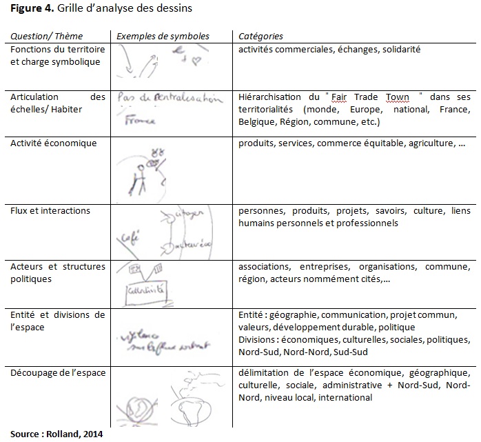 Deux lectures du territoire apparaissent. L’une exprime des valeurs, des idéaux, de l’ordre de l’intime, relatifs au commerce équitable à , l’autre illustre des éléments d’un territoire perçu dans sa dimension collective. Les dessins révèlent à la fois un territoire intentionnel (administration, drapeau, collectivité nommée et délimitée) et un territoire ressenti relevant des symboliques spatiales du commerce équitable (cœurs, échanges Nord Sud, liens entre acteurs).